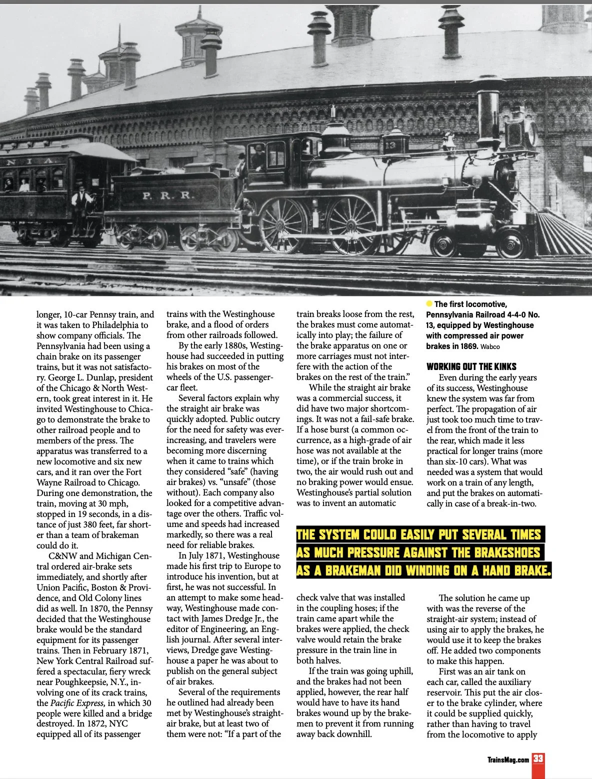 Olsen provides a detailed and comprehensive look at the early development of the railroad air brake, starting with George Westinghouse’s original inspiration. The article chronicles the ceaseless tinkering, testing, and trials that revolutionized railroads around the world.