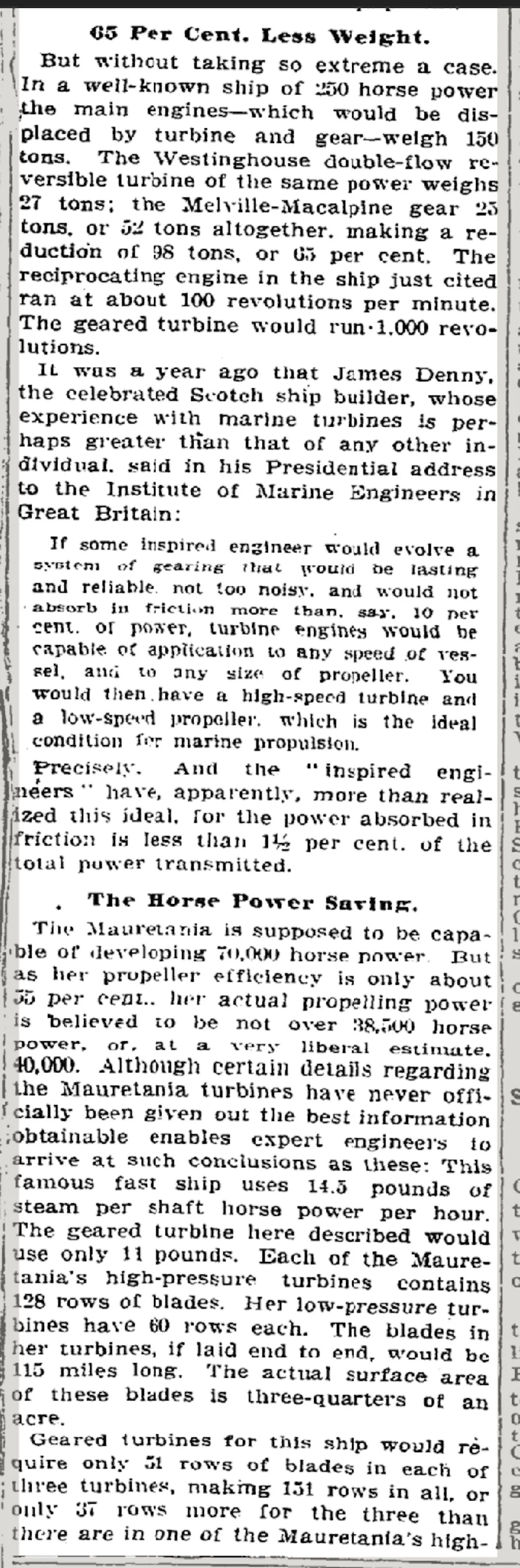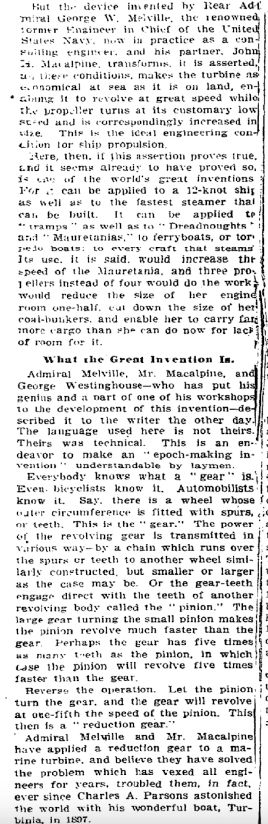 This front page article from the New York Times of October 3, 1909 detailed the critical work that Westinghouse, Rear-Admiral George Melville, and John Macalpine were doing that would revolutionize the propulsion of ships around the world.