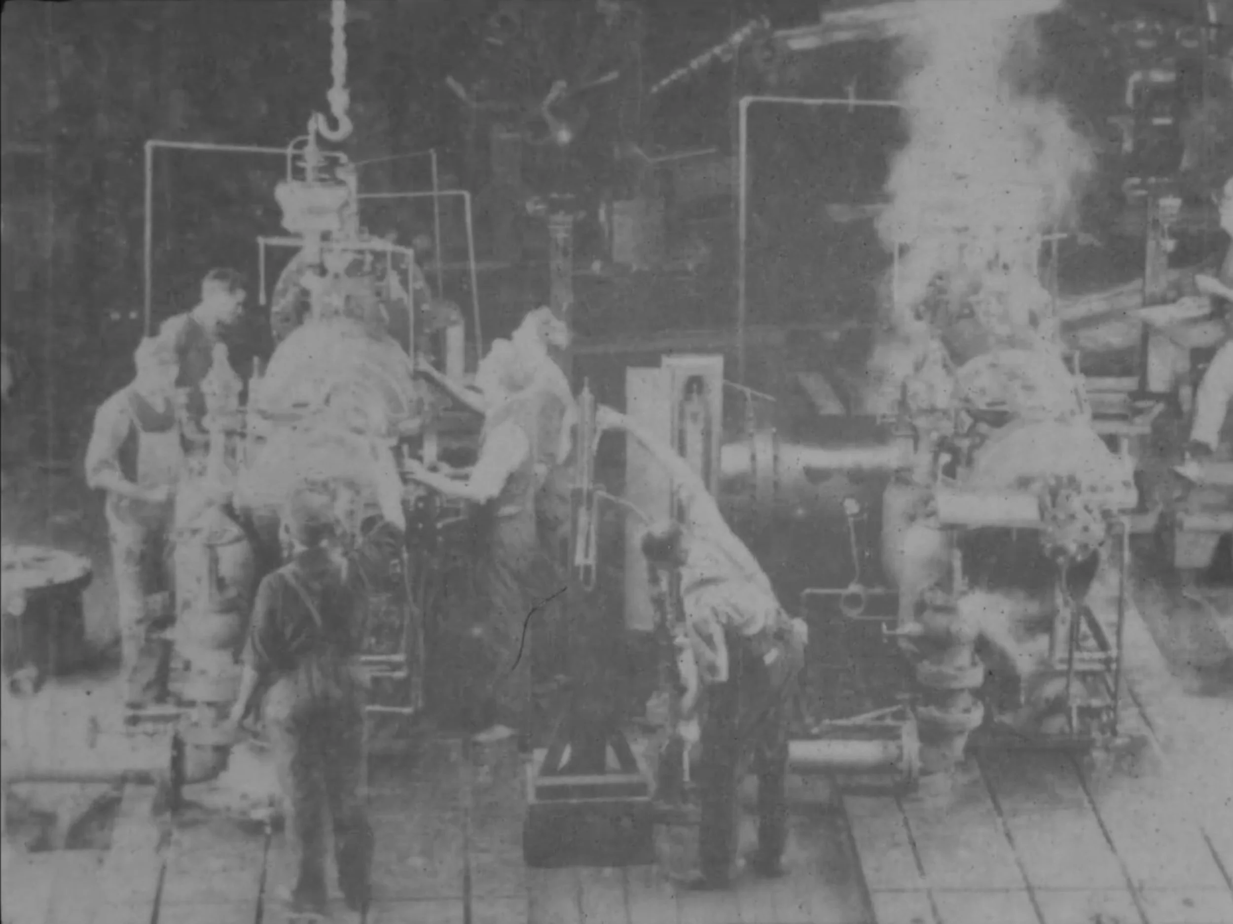 On the left of the screen, a small group of men lift the top off of what appears to be a turbine with a crane and continue to check the machine, tightening various parts with wrenches. On the right side, a few men appear to be testing the workings of what may be a turbine.