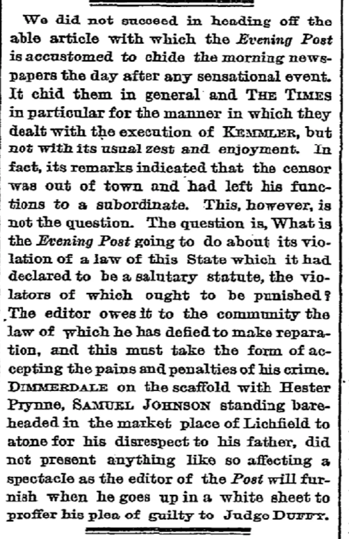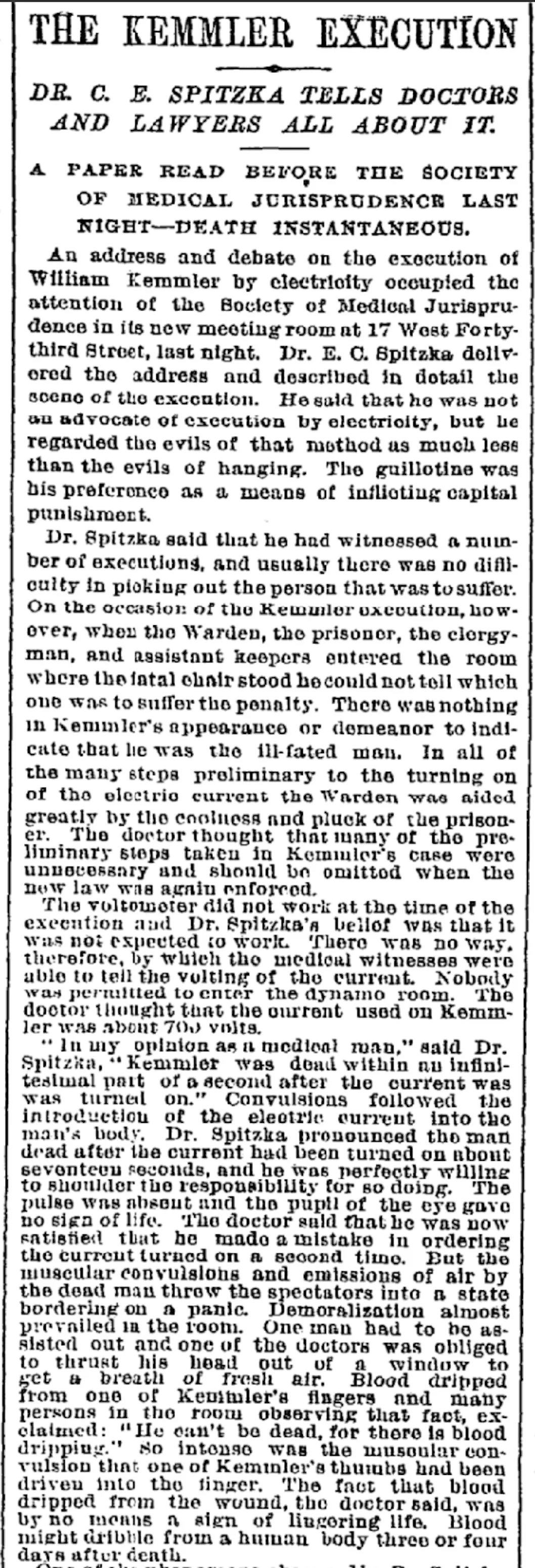 The essential results were that Kemmler’s execution took nearly eight minutes, because the electrical voltage was lower and less consistent than plans called for. After an inital jolt of power, Kemmler was still alive. So the switch was thrown a second time.